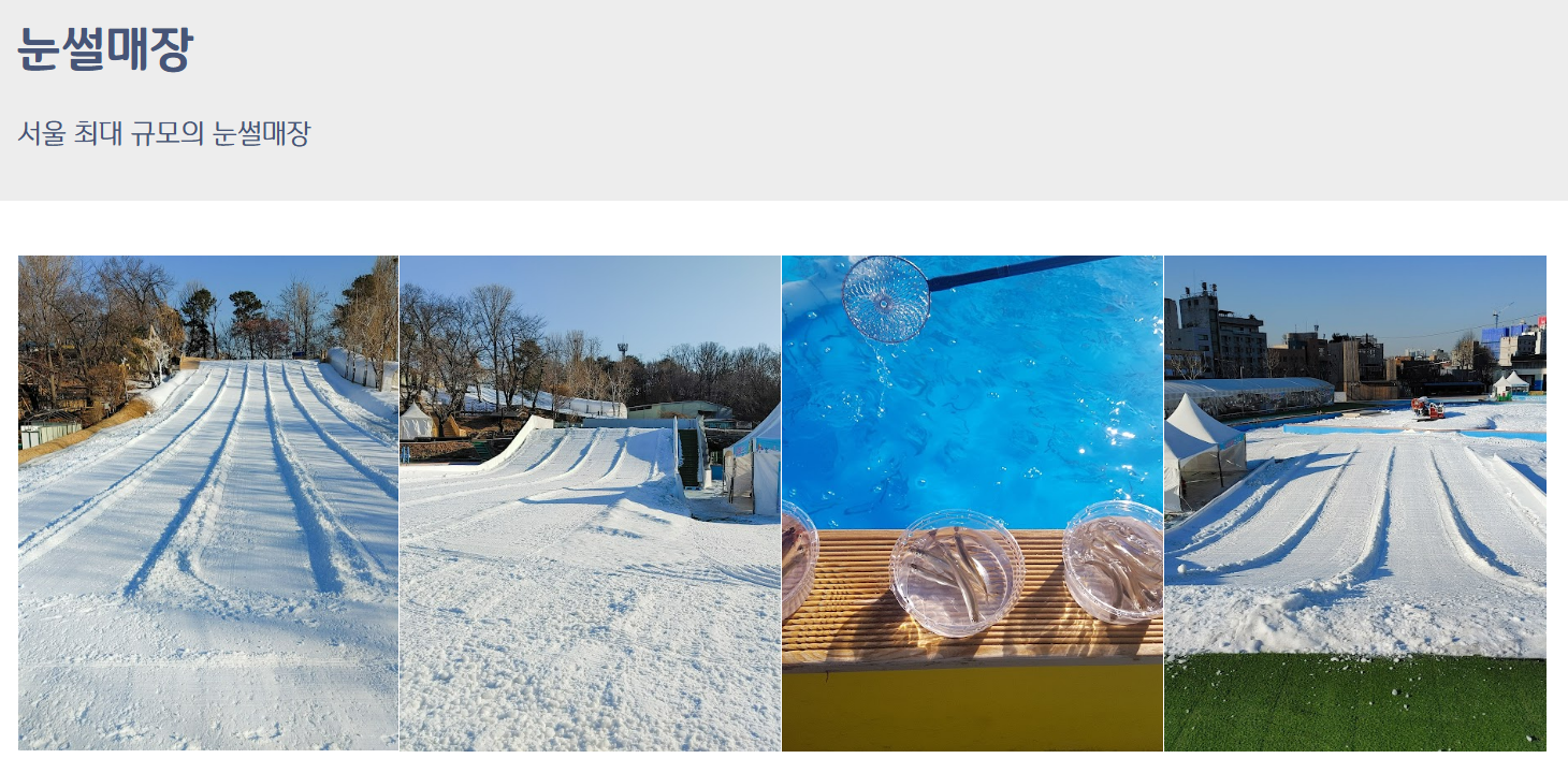 광진구 어린이회관에 위치한 눈썰매장으로 가족단위 방문객이 많습니다. 어린이대공원 옆으로 다양한 즐길거리가 있고 주차도 편리합니다.